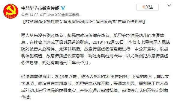 微博表示,赵明伟、尤泽燚两人从来没有到过毕节,却恶意编造传播在毕节、凯里等地性侵幼儿的虚假信息,在社会上造成了极其恶劣的影响。2019年12月30日,毕节市七星关区人民法院对被告人赵明伟、尤泽燚编造、故意传播虚假信息案进行一审公开宣判,以赵明伟犯编造、故意传播虚假信息罪,判处有期徒刑六年;以尤泽燚犯故意传播虚假信息罪,判处有期徒刑四年六个月。