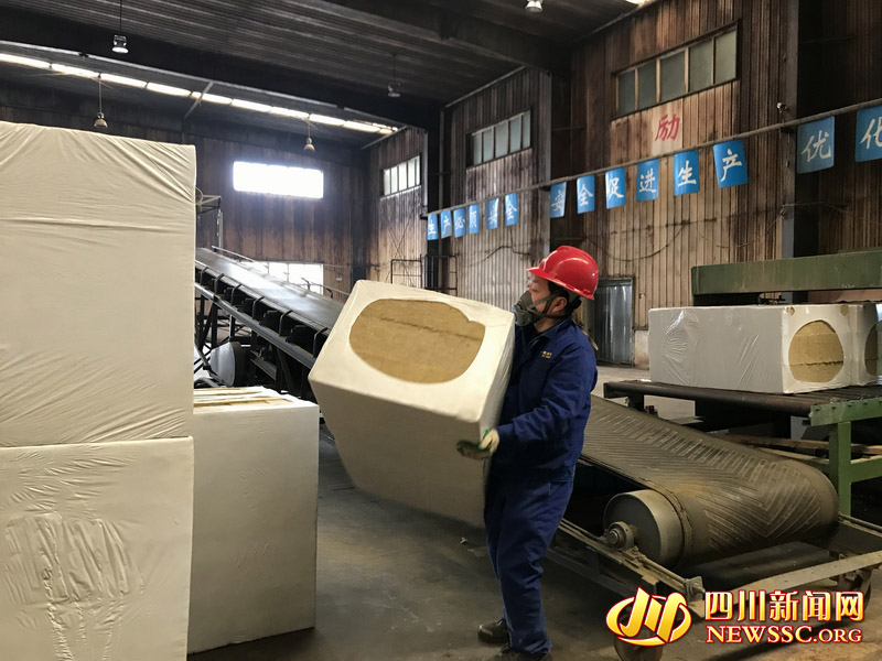 四川新闻网广安2月12日讯(黄辉 记者 熊强 摄影报道)2月12日,位于广安华蓥市的四川帕沃可矿物纤维制品有限公司生产车间内,坚硬的玄武岩被烧成红色岩浆,再经过离心机处理后,变成棉花一般的岩棉,然后在自动生产设备上经过锤摆、烘干、固化、冷却、切割等工序,生产出成品岩棉条,最后包装在洗衣机大小的箱子里,然后被运往各地作为活动板房保温材料。