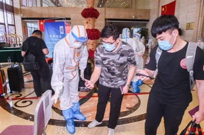 在隔离酒店门口,双流区九江社区卫生服务中心副主任谢飞和同事,已经做好了入境乘客的行李消杀准备。每一位乘客在接受全身消毒、安全脱除自带防护服,更换新口罩后,办理酒店入住,接受14天集中隔离观察。