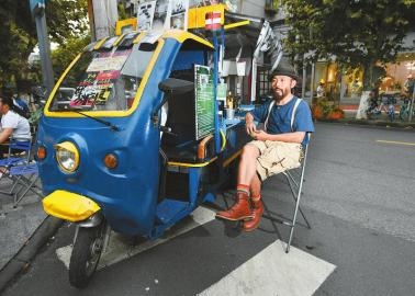 8月1日晚,创作者借助一辆三轮车在成都市芳草文创街区上办了一场个人影展。