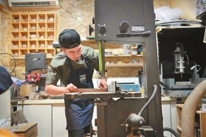 7月26日,成都“街FUN”文创街区中木艺工作室的成员正在制作木艺作品。