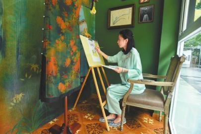 7月24日,古法旗袍设计师宋菲在绘手稿,她做的旗袍针脚细致、面料舒适,价格一般千元左右,高的可达万元以上。