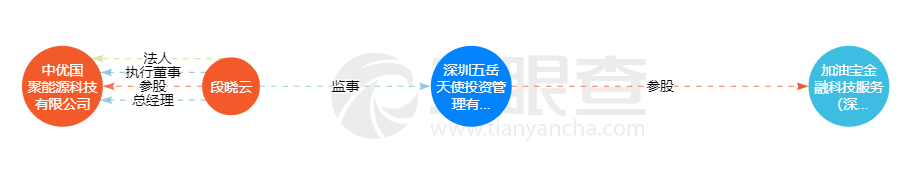 在第二个类目“投资”中,赫然显示“新手专享,参考年回报率10.0%,投资限额5000元,投资期限30天”。其他三个投资产品的参考年回报率是5.8%(30天)、6.8%(60天)、7.8%(90天),到期一次性还本付息。在购买页面,加油宝会让用户签署《用户服务协议》和《油品货权转让协议》和《商品转售声明》,产品详情显示“国家能源产业项目”,标注“银行监管多重保障”。商品转售声明是中优国聚能源科技有限公司 提供的。据天眼查,该公司与加油宝关联密切, “段晓云”是关联两公司的关键人物。