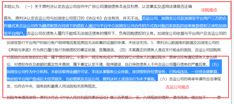吉运公司与加油宝的诉讼从2018年3月开庭至2019年5月进入执行阶段。就该案件本身来看,法院认为,吉运公司、加油宝公司及加油宝平台用户三方的合作模式系吉运公司作为融资租赁合同项下的债权人通过与平台中介加油宝公司合作的方式将对数百家医院的应收账款债权让度给加油宝平台用户。吉运公司在债务人履约不能或无法偿还债务的情形下,负有回购债权的义务。本案案由是“债权转让合同纠纷”,围绕债权转让合同进行,最终法院判决吉运公司应向中广投公司清偿债务本金及利息。