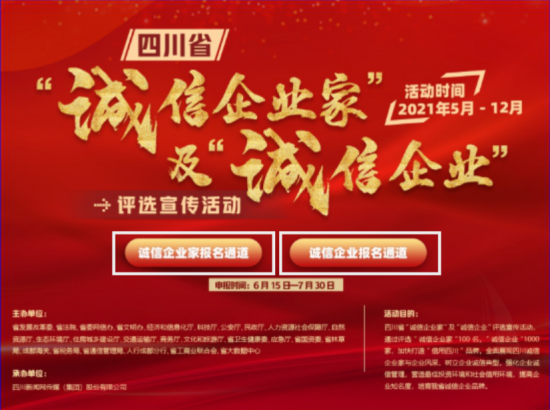 访问“四川省‘诚信企业家’及‘诚信企业’评选宣传活动”专题页面,点击“诚信企业家报名通道”或“诚信企业报名通道”(下图白框处)进入报名页面。