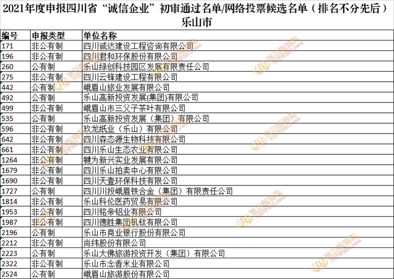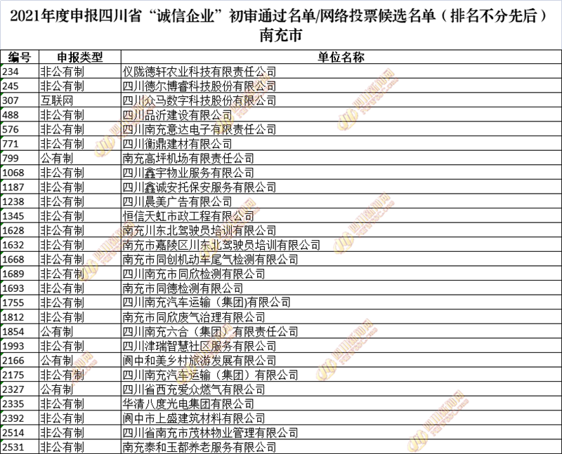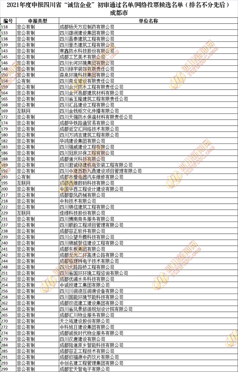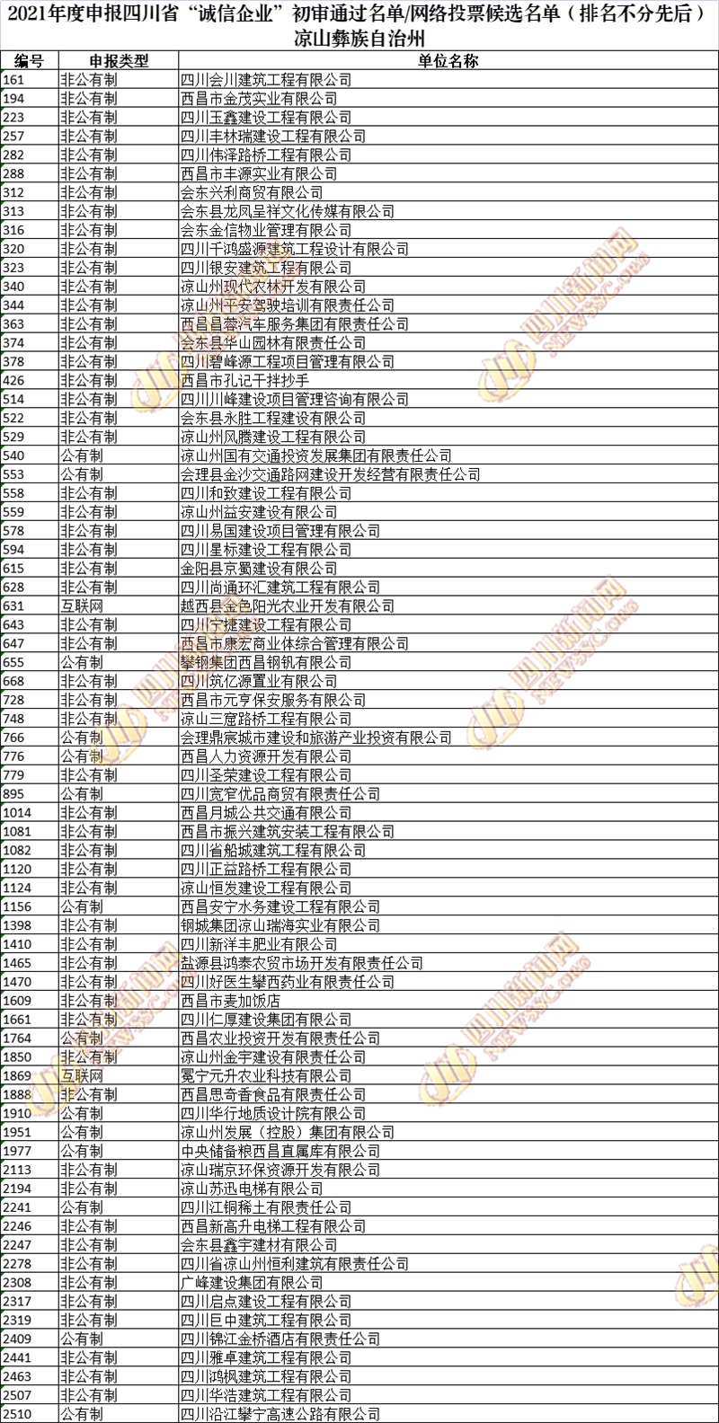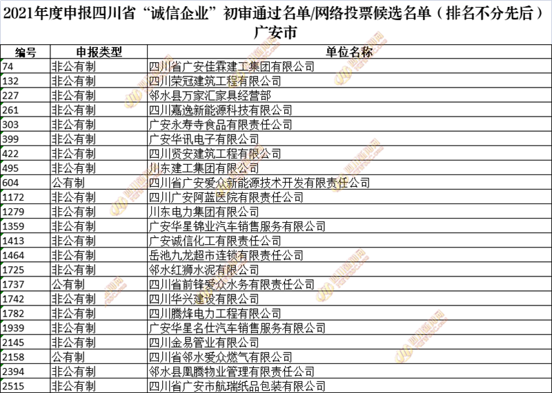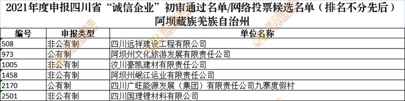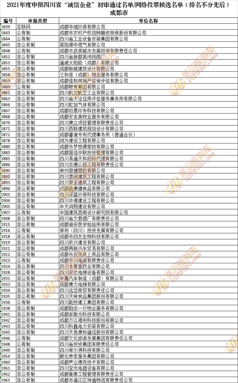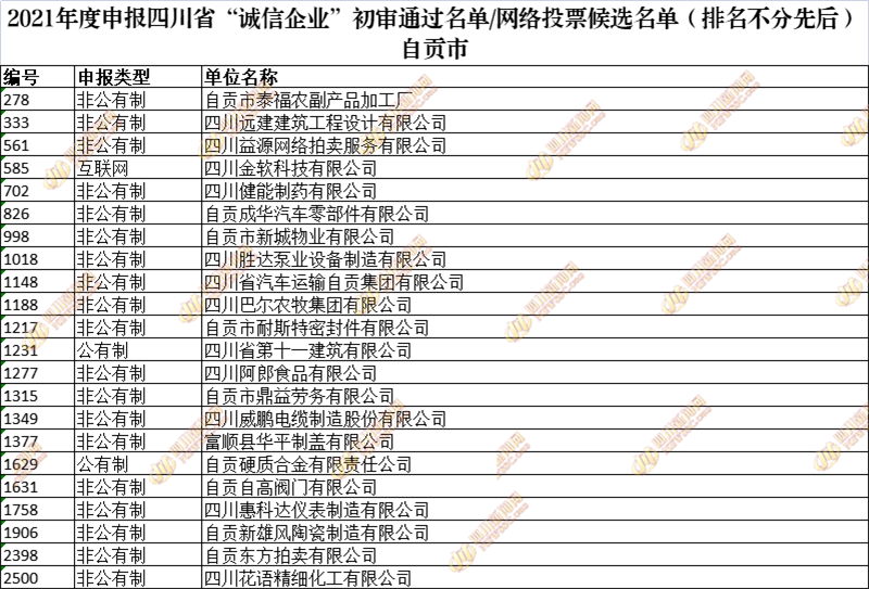 “诚信企业”初审通过名单/网络投票候选名单公布如下: