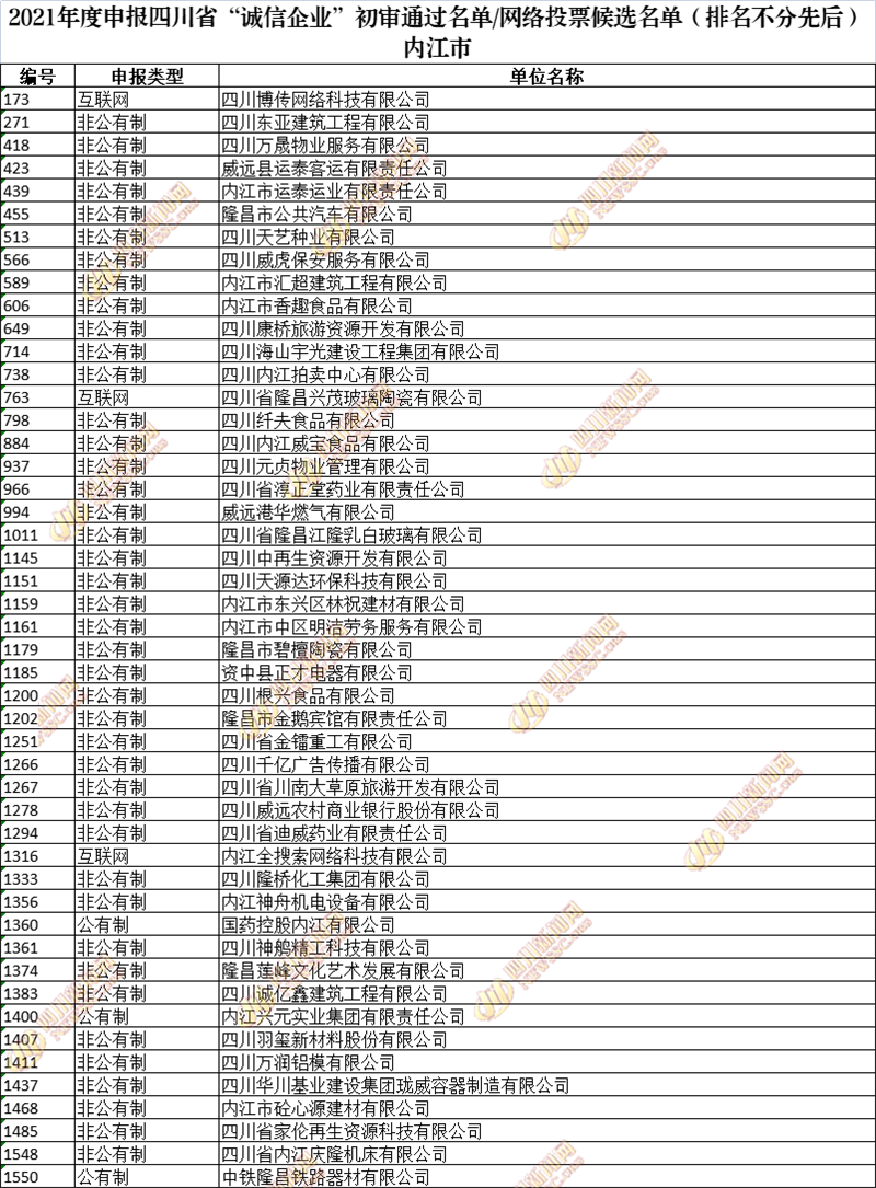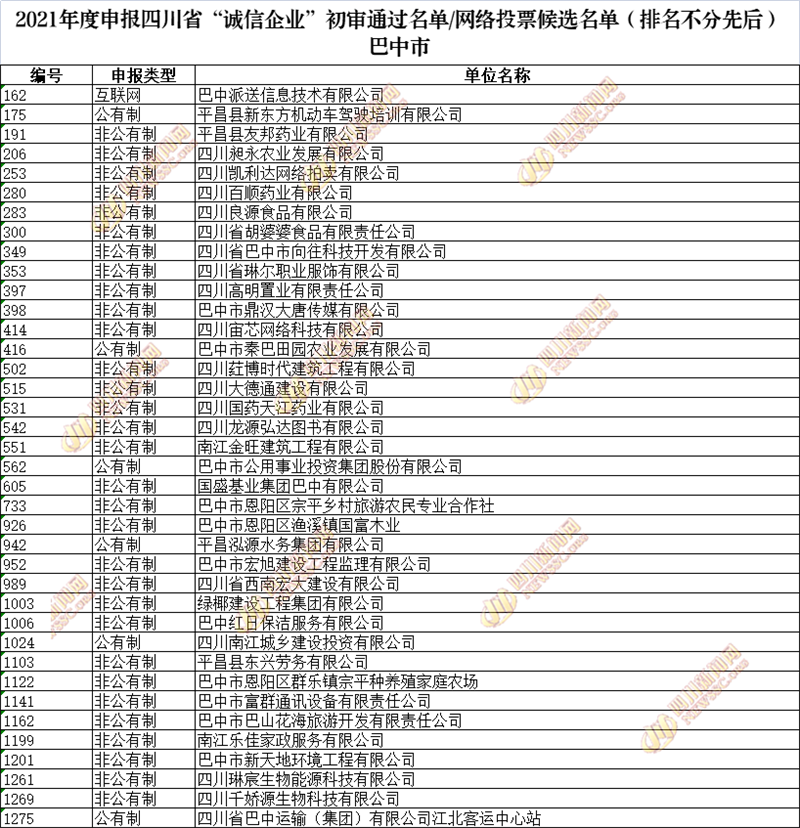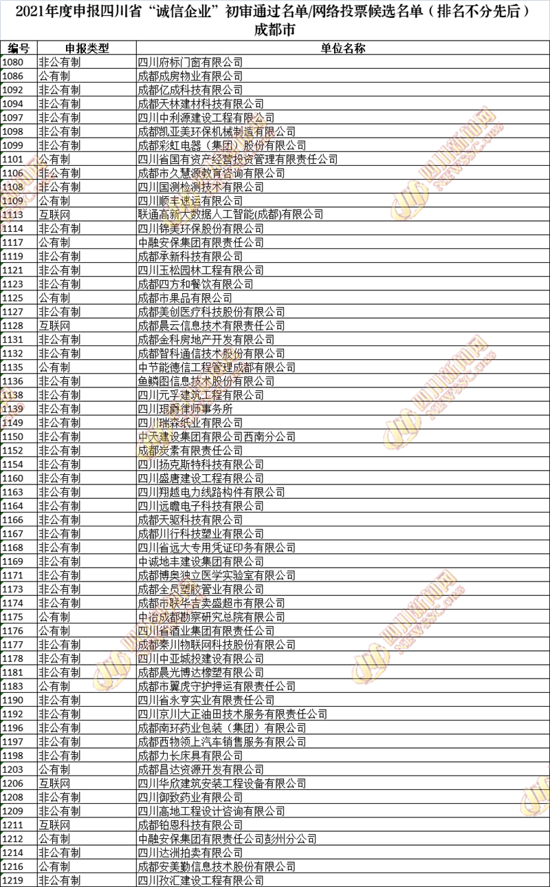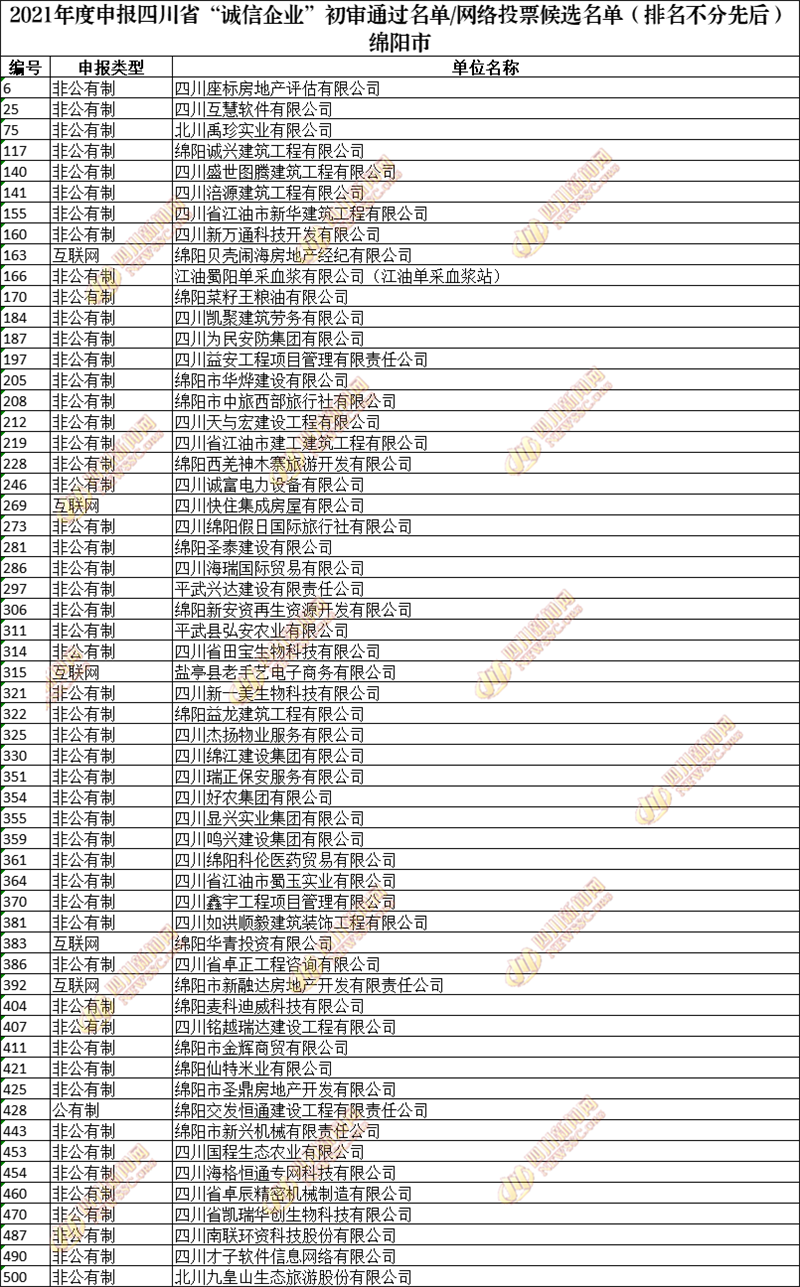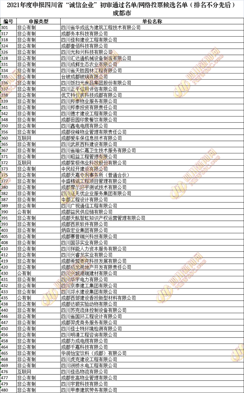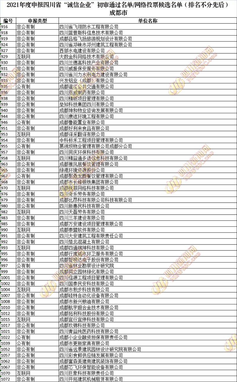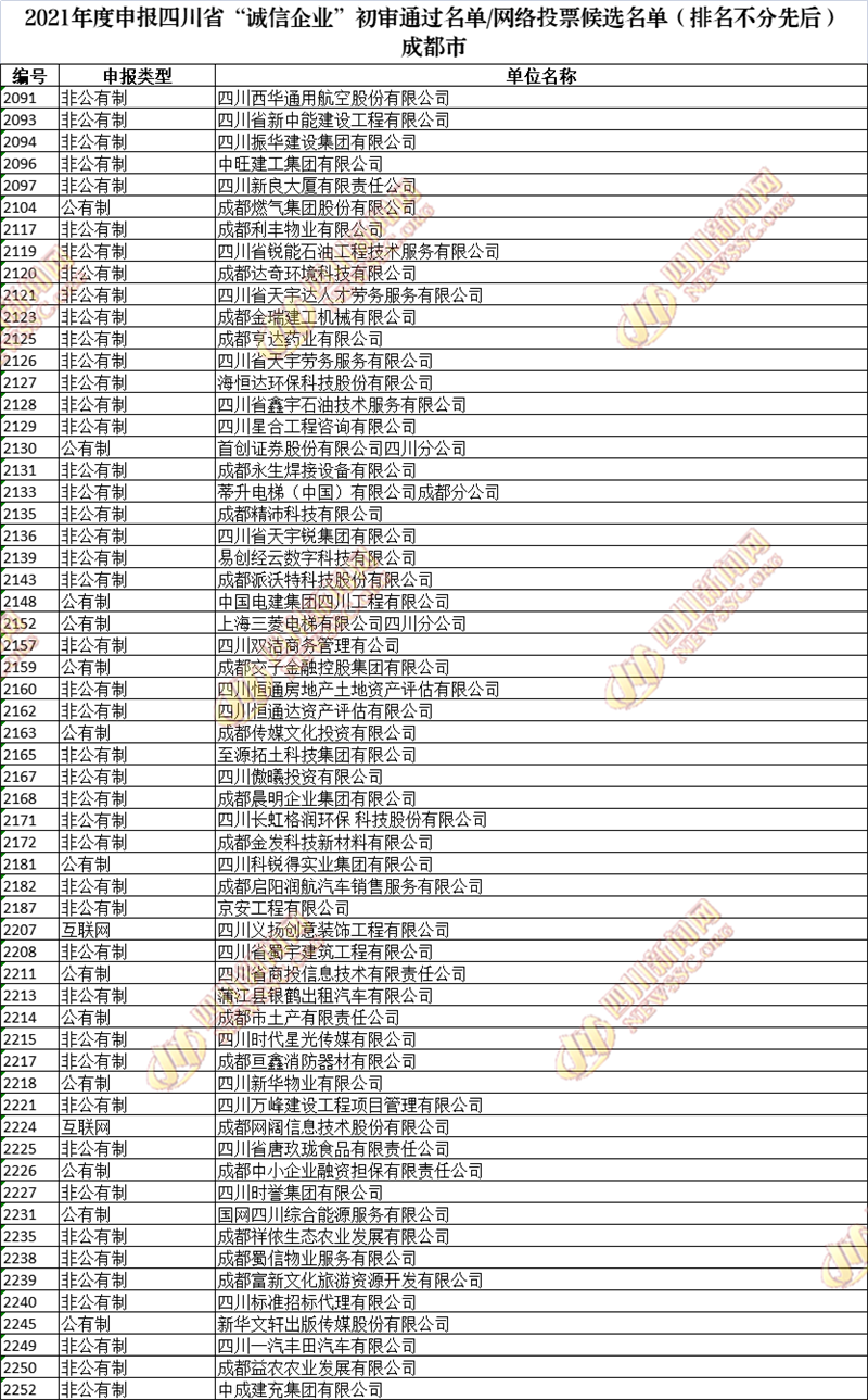 “诚信企业”初审通过名单/网络投票候选名单公布如下:
