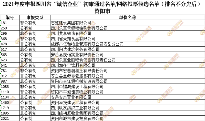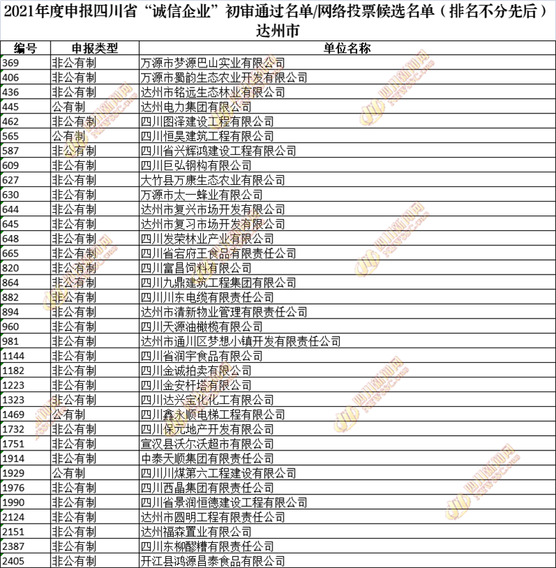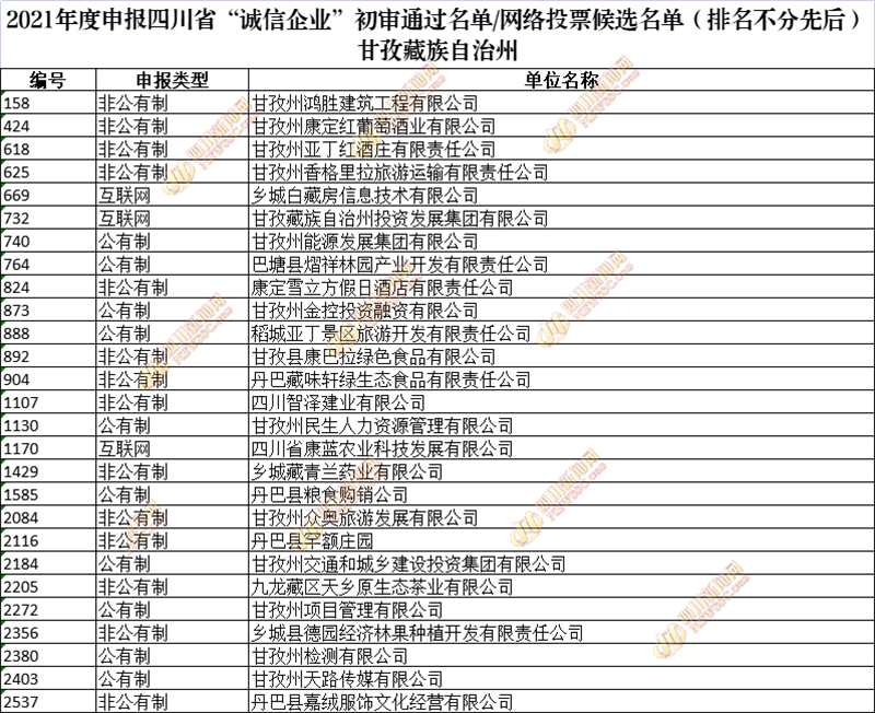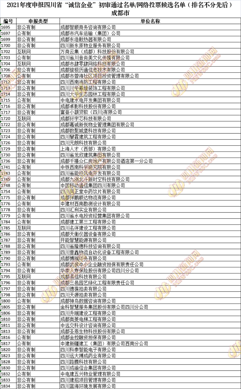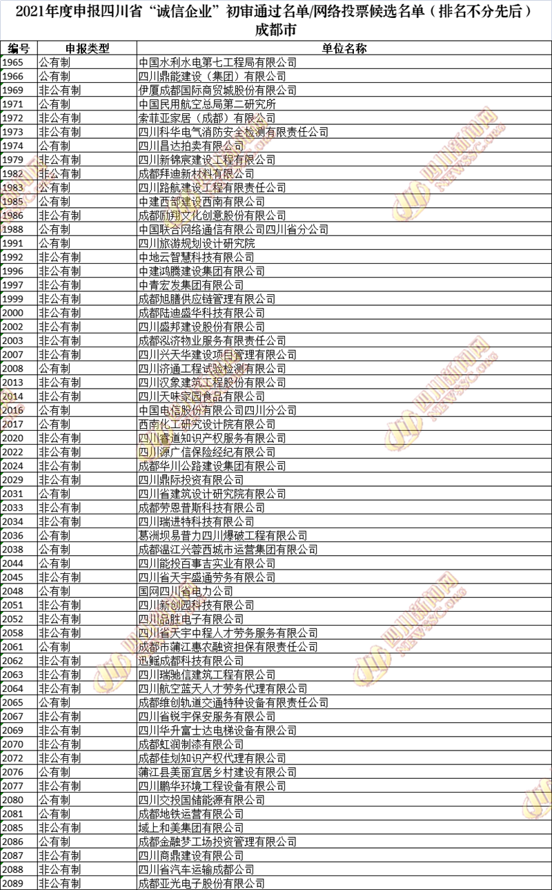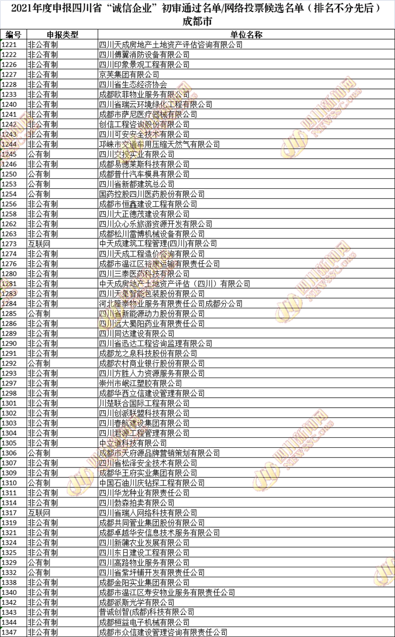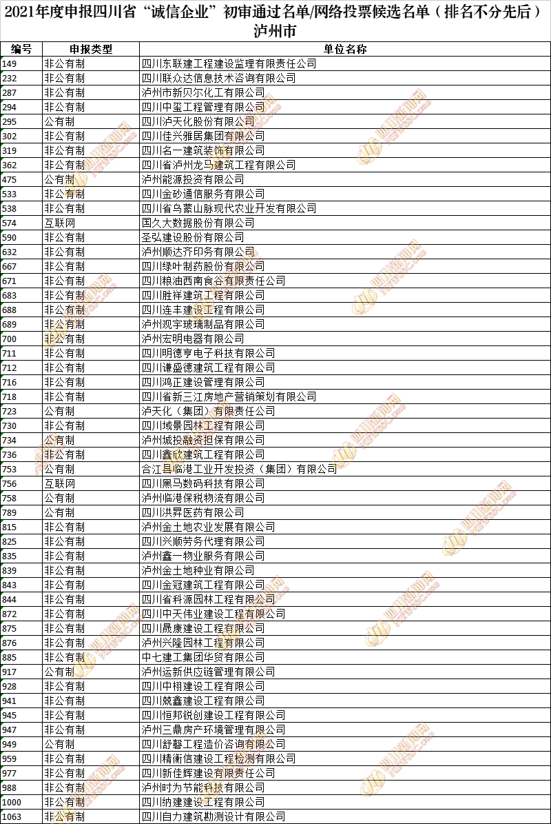 “诚信企业”初审通过名单/网络投票候选名单公布如下: