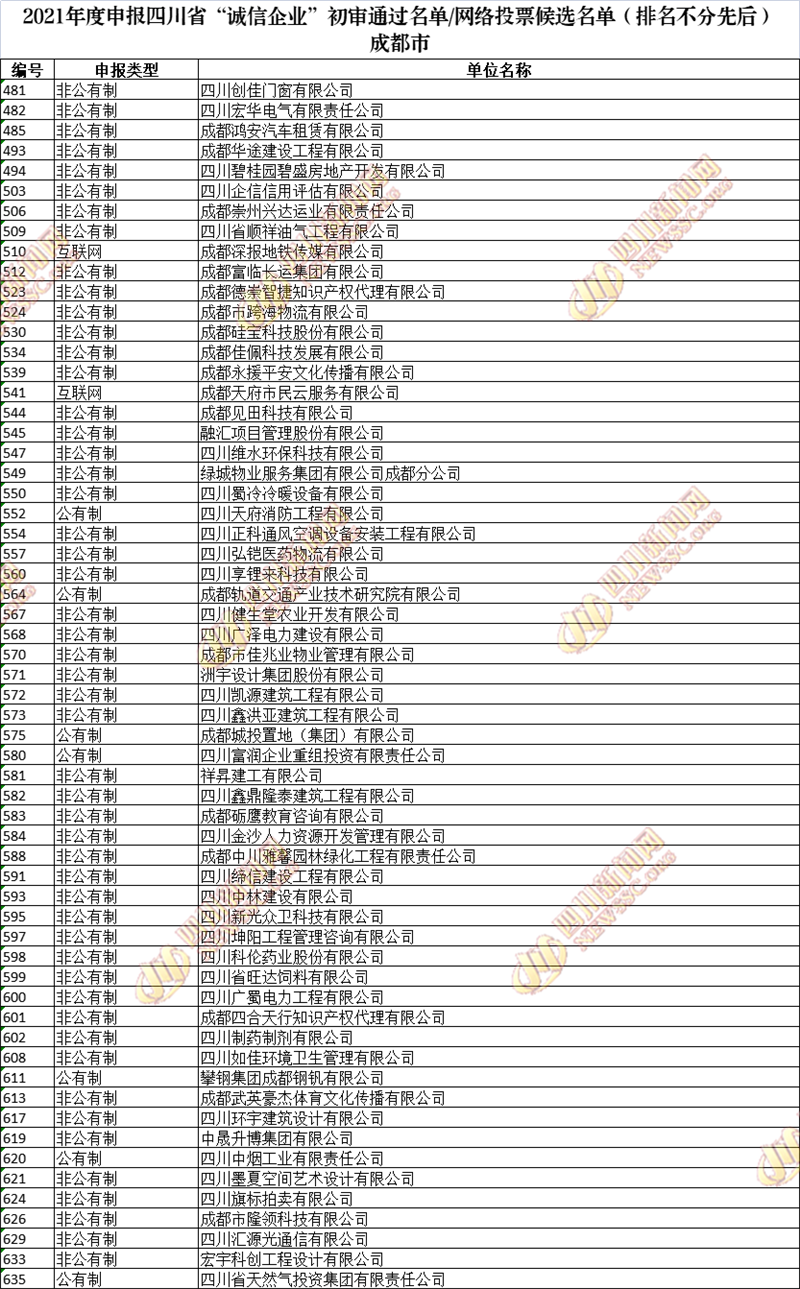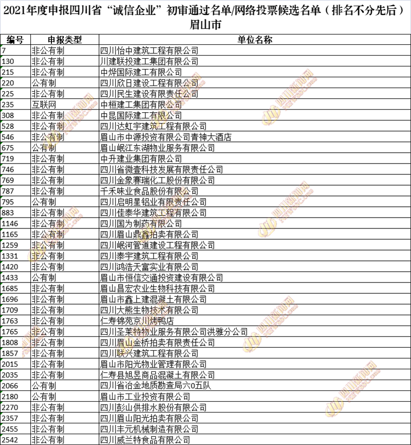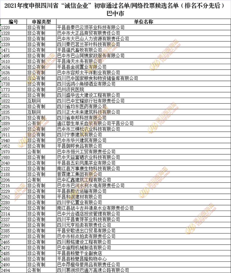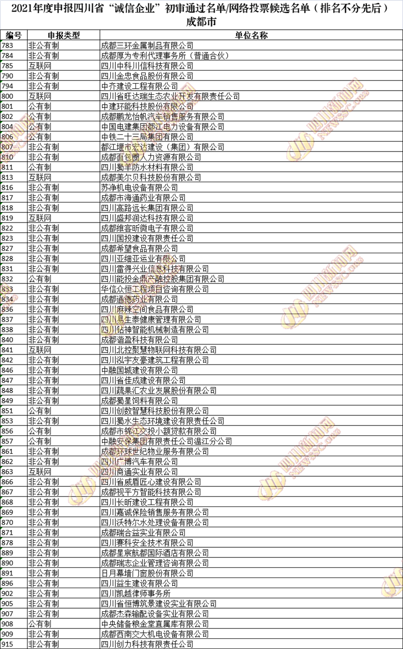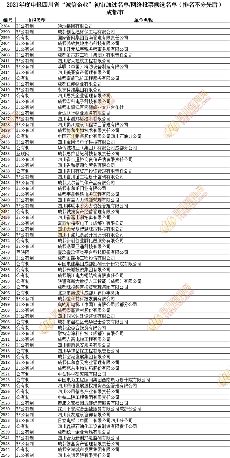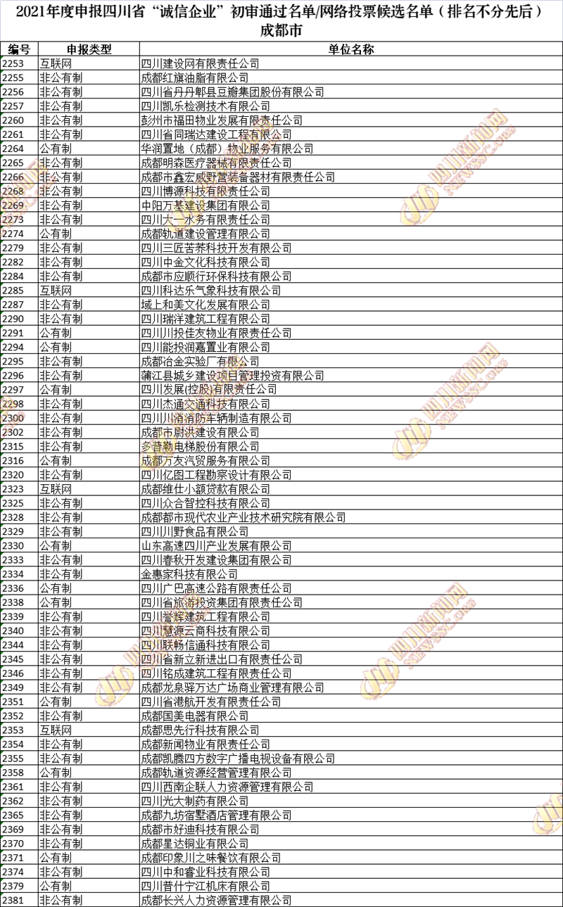 “诚信企业”初审通过名单/网络投票候选名单公布如下: