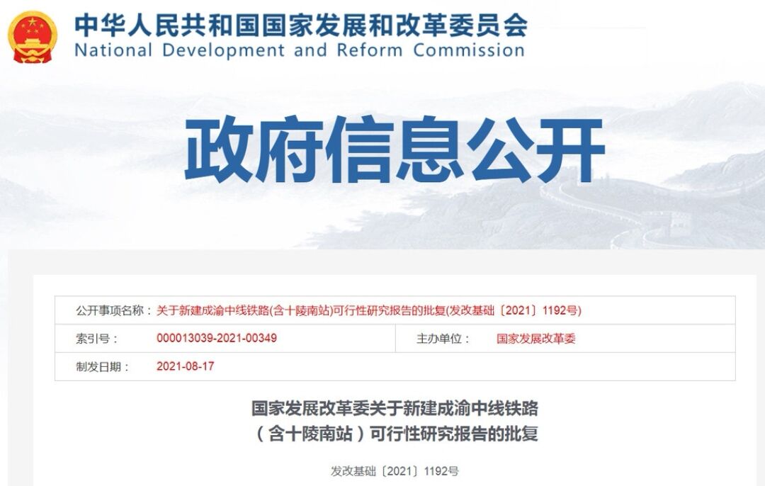 25日,四川新闻网记者从国家发展改革委官网获悉,近日国家发展改革委正式批复新建成渝中线铁路(含十陵南站)可行性研究报告。