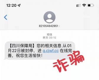 近日,省医保局接到部分群众反映,有不法分子向我省参保群众推送诈骗短信,相关内容为:“【四川保障局】您的相关信息从01月××日被封停,进q.c jwf.cc在线完善,祝您生活愉快!”以此诱导群众点击网址链接。点开链接后,跳转的页面与官方网页非常相似。如果按页面上的提示填写了身份证号、银行卡号、银行卡密码、预留手机号、验证码等信息,会导致受害人手机和银行卡等信息被盗、银行卡被盗刷等。