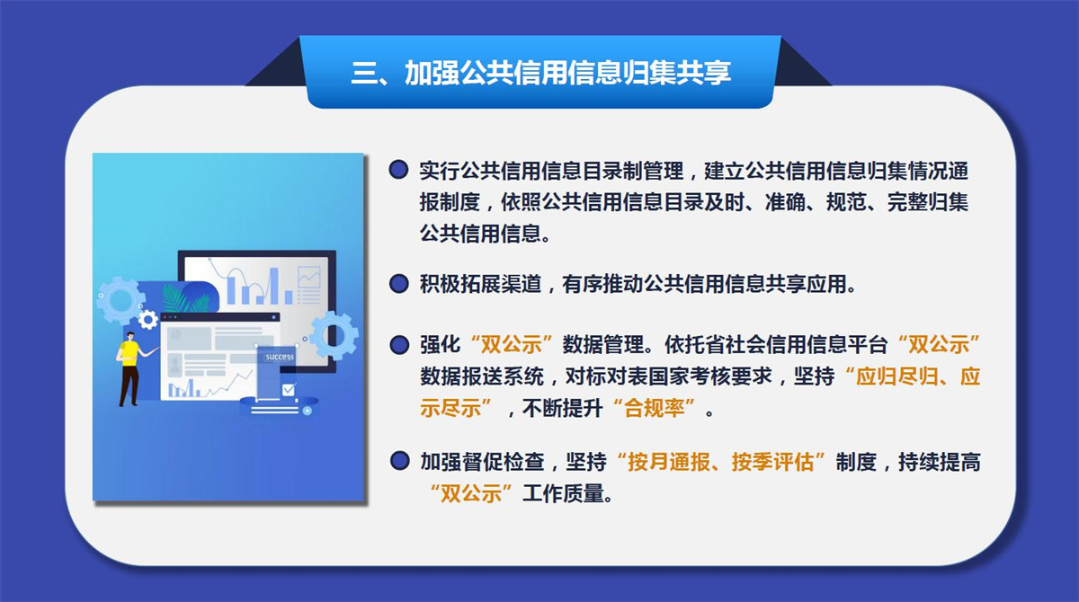 2022年全省社会信用体系建设工作坚持以习近平新时代中国特色社会主义思想为指导,深入贯彻党的十九大及十九届历次全会精神,全面落实党中央、国务院和省委、省政府关于社会信用体系建设的工作部署,坚持“政府推动、社会共建,制度先行、以用促建”的工作思路,主动作为,开拓创新,努力推动全省社会信用体系建设再上新台阶。