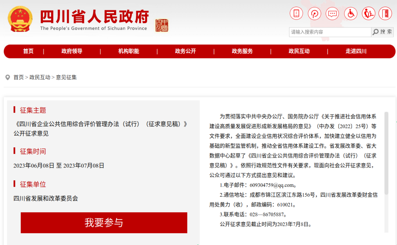 为贯彻落实中共中央办公厅、国务院办公厅《关于推进社会信用体系建设高质量发展促进形成新发展格局的意见》(中办发〔2022〕25号)等文件要求,近日,四川省发展和改革委员会、四川省大数据中心起草了《四川省企业公共信用综合评价管理办法(试行)(征求意见稿)》(下称《征求意见稿》),并向社会公开征求意见,截止时间为2023年7月8日。