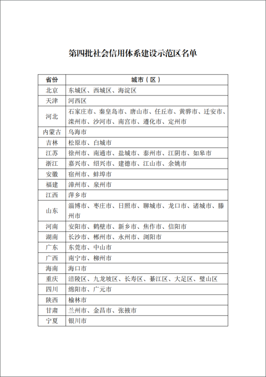根据通知,第四批社会信用体系建设示范区包括:北京市东城区、西城区、海淀区,天津市河西区,河北省石家庄市、秦皇岛市、唐山市、任丘市、黄骅市、迁安市、滦州市、沙河市、南宫市、遵化市、定州市,内蒙古自治区乌海市,吉林省松原市、白城市,江苏省徐州市、南通市、盐城市、泰州市、江阴市、如皋市,浙江省嘉兴市、绍兴市、建德市、江山市、余姚市,安徽省宿州市、蚌埠市,福建省漳州市、泉州市,江西省萍乡市,山东省淄博市、枣庄市、日照市、聊城市、龙口市、诸城市、滕州市,河南省安阳市、鹤壁市、新乡市、焦作市、信阳市,湖南省长沙市、郴州市、永州市、浏阳市,广东省东莞市、中山市,广西壮族自治区南宁市、柳州市,海南省海口市,重庆市涪陵区、九龙坡区、长寿区、綦江区、大足区、璧山区,四川省绵阳市、广元市,陕西省榆林市,甘肃省兰州市、金昌市、张掖市,宁夏回族自治区银川市。
