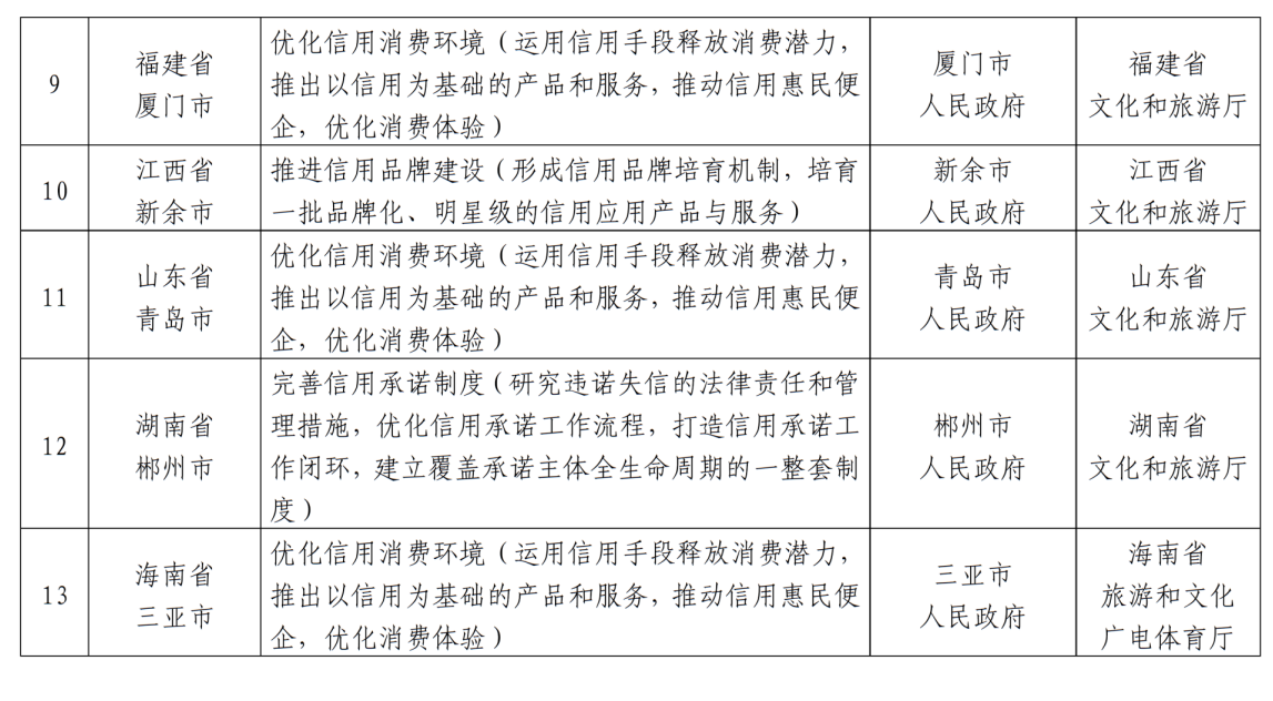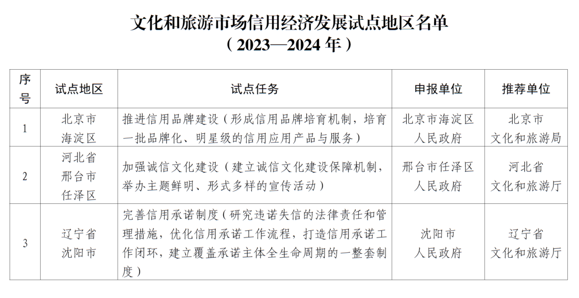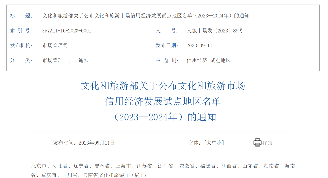 9月11日,文化和旅游部公布新一轮文旅市场信用经济发展试点地区。为进一步推动信用理念、信用制度、信用手段与文化和旅游市场各方面各环节深度融合,更好回应地方发展信用经济的需求,在系统总结前期试点经验的基础上,结合当前推动文化和旅游市场高质量发展的现实需求,文化和旅游部启动了文化和旅游市场信用经济发展试点工作(2023—2024年)。