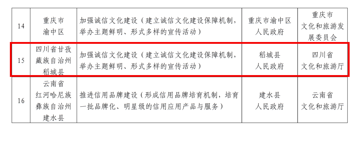 经地方申报、省厅推荐、专家评审、台账校验等程序,确定全国16个文化和旅游市场信用经济发展试点地区,我省甘孜藏族自治州稻城县入选。据悉,2021年12月,文化和旅游部办公厅公布了全国首批文化和旅游市场信用经济发展试点地区,确定了14个试点地区,峨眉山市作为四川省唯一的入选城市名列全国14个试点地区之列,并在最终验收结果中获评为优秀。