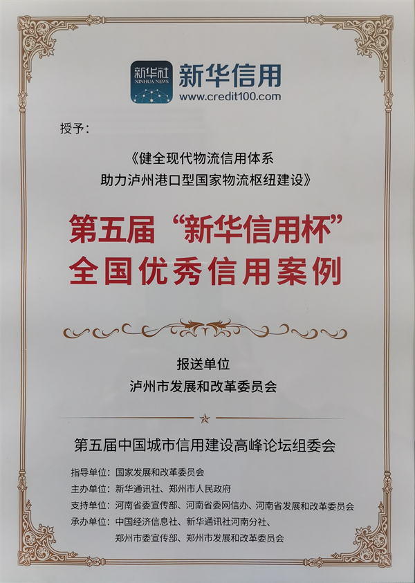 日前,在郑州举办的第五届中国城市信用建设高峰论坛上,公布了第五届“新华信用杯”全国优秀信用案例暨优秀信用应用场景微视频征集活动评选结果。泸州市报送的《健全现代物流信用体系 助力泸州港口型国家物流枢纽建设》案例,成功入选第五届“新华信用杯”全国信用优秀案例。本次案例评选旨在展示各地区各行业社会信用体系建设工作最新成果,发掘推动支撑经济社会高质量发展的实践探索经验,充分发挥示范引领作用,在全社会营造良好的诚信氛围。