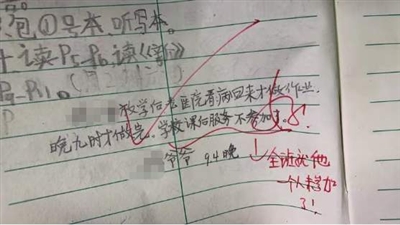 第二张照片为学生作业本的一页,显示学生家长(爷爷)在作业本上批注“XXX放学后去医院看病回来才做作业,晚九时才做完,学校课后服务不参加了。(XX爷爷,9.4晚)”同时旁边还有一行红字的批注“全班就他一个人未参加了!”随后,该区教育局工作人员立刻与相关学校分管副校长取得了联系,请学校进一步核实情况。