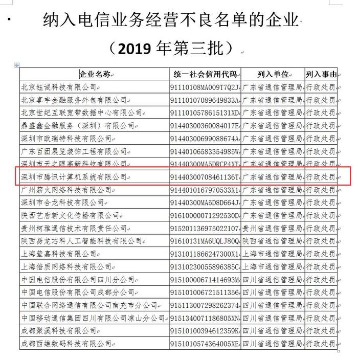 29日,工信部官网显示,①三季度,21家企业因无证经营、超范围经营、不配合监督检查、违反实名制规定等行为,受到电信管理机构行政处罚并被纳入电信业务经营不良名单。其中包括深圳市腾讯计算机系统有限公司。②此外,截至目前共有1家企业,即北京金诚网信通信技术有限公司,因行政处罚被纳入电信业务经营失信名单。企查查显示,该公司注册资本200万元,经理,执行董事和实际控制人为刘艳玲。