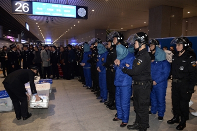 12月1日下午6时许,成都东客站。由天津西开往重庆西的G1709次列车缓缓开进成都东,停靠在26站台。站台上,来自四川眉山警方的多名警务人员已早早在此等候。车门打开,6名被头套包裹的犯罪嫌疑人被一一押下车。