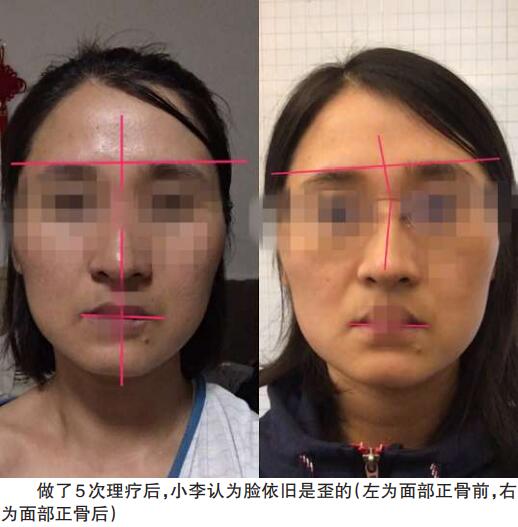 当天在现场,小李和两位调理师就5次调理后脸部歪斜是否更加严重的问题,依旧各执一词。