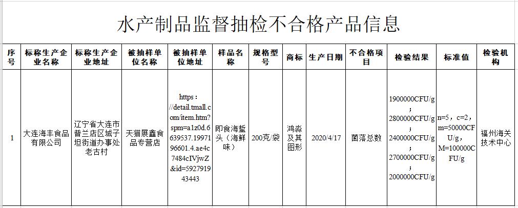 通告显示,天猫展鑫食品专营店(经营者为辽宁省大连展鑫商贸有限公司)在天猫(网店)销售的、标称辽宁省大连海丰食品有限公司生产的即食海蜇头(海鲜味),菌落总数不符合食品安全国家标准规定。