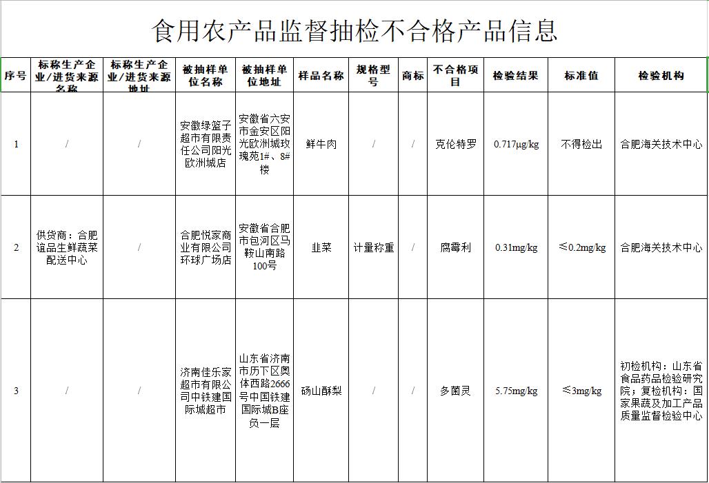 其中,天猫、淘宝平台网店因微生物污染、质量指标与标签标示值不符问题被点名,山东佳乐家超市、安徽绿篮子超市等线下门店因农兽药残留超标问题被点名。