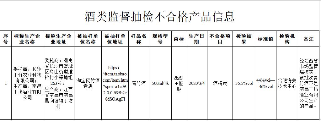 通告显示,淘宝网竹酒专店(经营者为湖南省长沙市望城区朱亮酒水商行)在淘宝网(网店)销售的、标称湖南省长沙玉竹农业科技有限公司委托江西省南昌丁坊酒业有限公司生产的青竹酒,经合肥海关技术中心检验发现,其中酒精度不符合产品标签标示要求。南昌丁坊酒业有限公司对产品真实性提出异议。经江西省市场监管局核实,该批次青竹酒是假冒南昌丁坊酒业有限公司生产的产品。