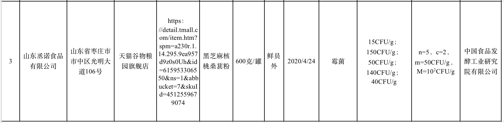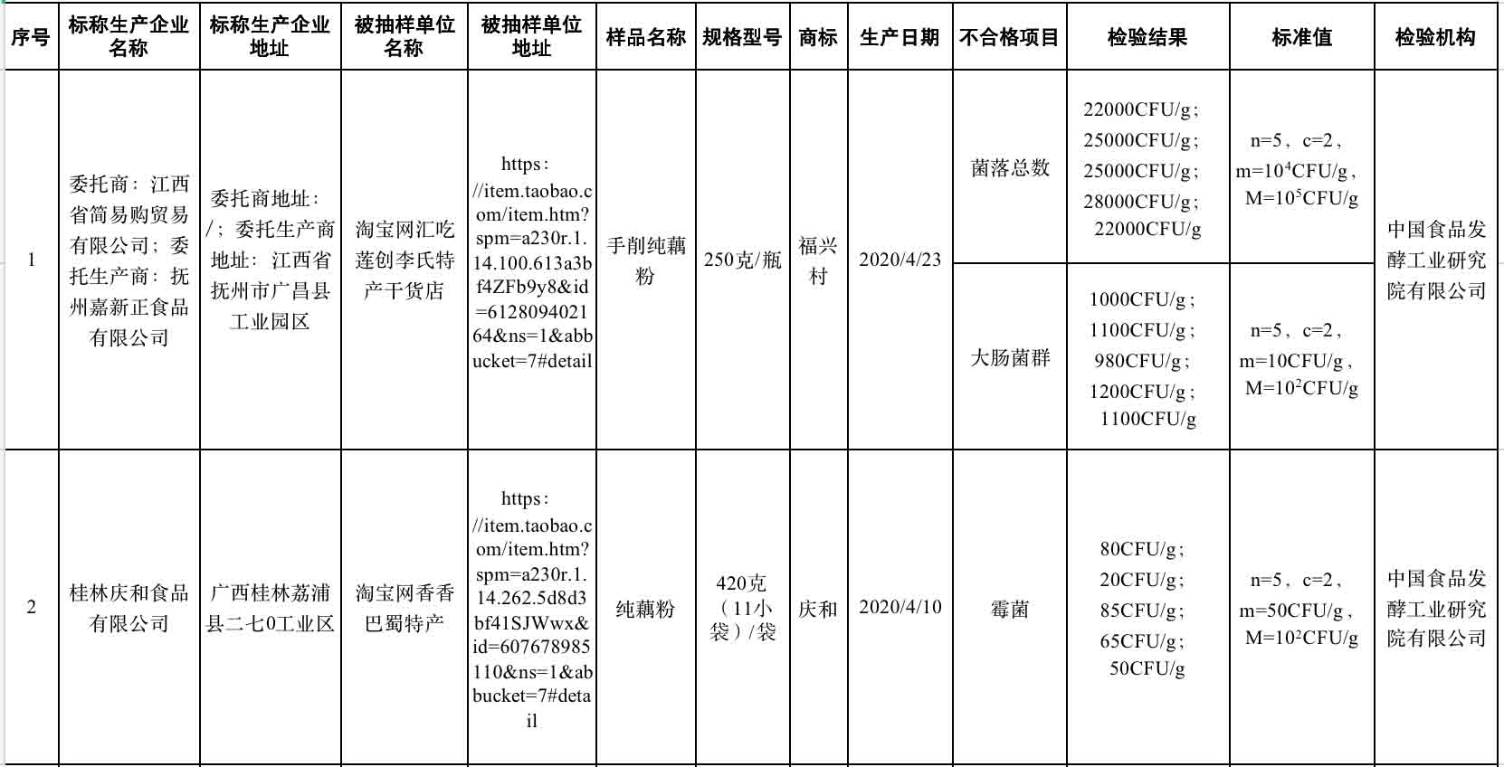 同时,淘宝网香香巴蜀特产(经营者为四川省内江市隆昌市桂香食品经营部)在淘宝网(网店)销售的、标称广西壮族自治区桂林庆和食品有限公司生产的纯藕粉,天猫谷物粮园旗舰店(经营者为山东省枣庄丞诺电子商务有限公司)在天猫(网店)销售的、标称山东丞诺食品有限公司生产的黑芝麻核桃桑葚粉,霉菌均不符合食品安全国家标准规定。
