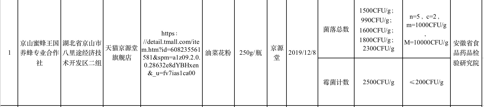 天猫京源堂旗舰店(经营者为湖北省京山蜜蜂王国养蜂专业合作社)在天猫(网店)销售的、标称湖北省京山蜜蜂王国养蜂专业合作社生产的油菜花粉,菌落总数、霉菌计数不符合食品安全国家标准规定。