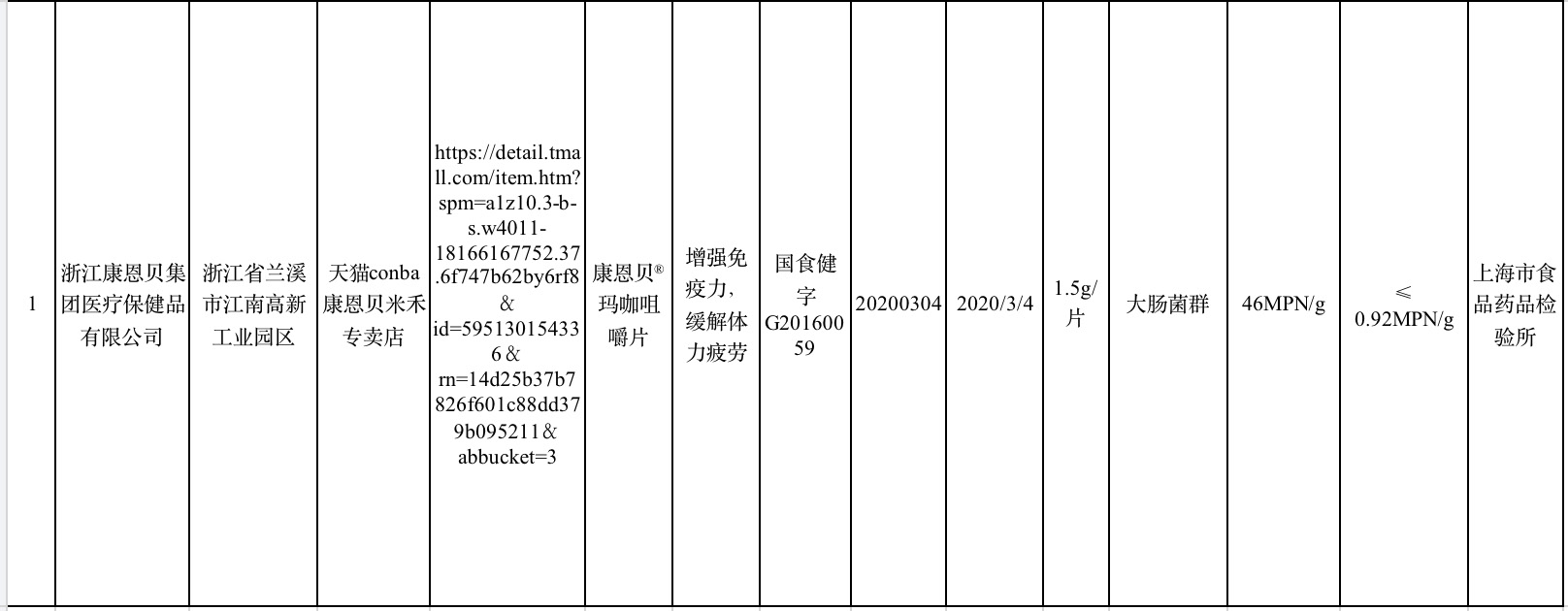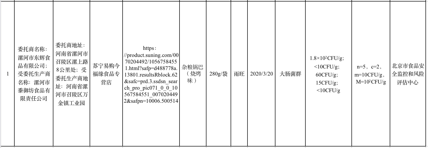 此外,苏宁易购今福缘食品专营店(经营者为河南今福缘电子商务有限公司)在苏宁易购(网店)销售的、标称河南省漯河市东辉食品有限公司委托河南省漯河市黍御坊食品有限责任公司生产的杂粮锅巴(烧烤味),天猫conba康恩贝米禾专卖店(经营者为浙江省温州米禾贸易有限公司)在天猫(网店)销售的、标称浙江康恩贝集团医疗保健品有限公司生产的康恩贝·玛咖咀嚼片,大肠菌群均不符合食品安全国家标准规定。