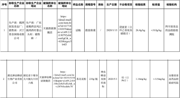 同时,天猫滑派旗舰店(经营者为河北省石家庄翼同鑫商贸有限公司)在天猫(网店)销售的、标称广东省揭阳市揭西创发食品厂生产的话梅(标称销售商:广东省梅州市兴宁贵食网络有限公司),甜蜜素(以环己基氨基磺酸计)不符合食品安全国家标准规定。
