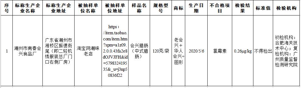 通告显示,淘宝网潮味老店(经营者为广东省汕头市龙湖区潮味食品店)在淘宝网(网店)销售的、标称广东省潮州市南春会兴食品厂生产的会兴腊肠(中式腊肠)。经合肥海关技术中心检验发现,其中氯霉素不符合食品安全国家标准规定。广东省潮州市南春会兴食品厂对检验结果提出异议,并申请复检;经广州质量监督检测研究院复检后,维持初检结论。