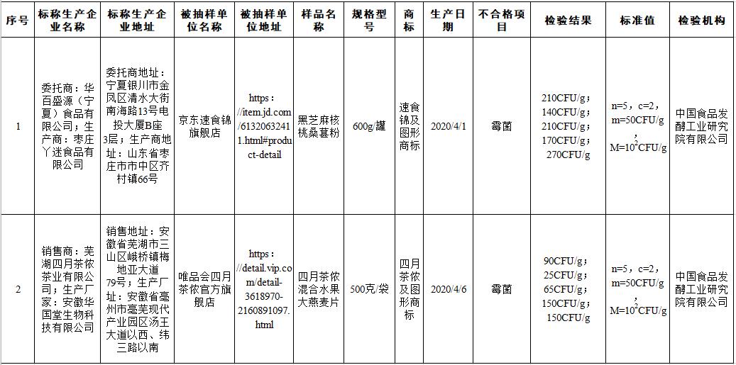 同时,京东速食锦旗舰店(经营者为华百盛源(宁夏)食品有限公司)在京东商城(网店)销售的、标称华百盛源(宁夏)食品有限公司委托山东省枣庄丫迷食品有限公司生产的黑芝麻核桃桑葚粉;唯品会四月茶侬官方旗舰店(经营者为安徽省芜湖四月茶侬茶业有限公司)在唯品会(网店)销售的、标称安徽华国堂生物科技有限公司生产的四月茶侬混合水果大燕麦片(标称销售商:安徽省芜湖四月茶侬茶业有限公司),两款产品霉菌不符合食品安全国家标准规定。