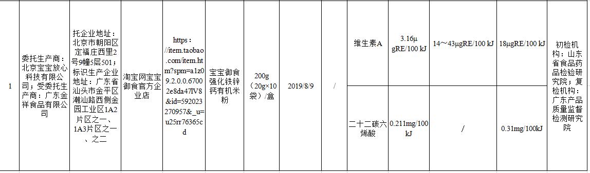 此外,浙江省宁波市北仑区新碶丁庆环蔬菜摊销售的韭菜,腐霉利不符合食品安全国家标准规定。淘宝网宝宝御食官方企业店(经营者为北京宝宝放心科技有限公司)在淘宝网(网店)销售的、标称北京宝宝放心科技有限公司委托广东金祥食品有限公司生产的宝宝御食强化铁锌钙有机米粉,经山东省食品药品检验研究院检验发现,其中维生素A不符合食品安全国家标准规定,二十二碳六烯酸检出值低于产品包装标签标示值的80%。广东金祥食品有限公司对检验结果提出异议,并申请复检;经广东产品质量监督检测研究院复检后,维持初检结论。