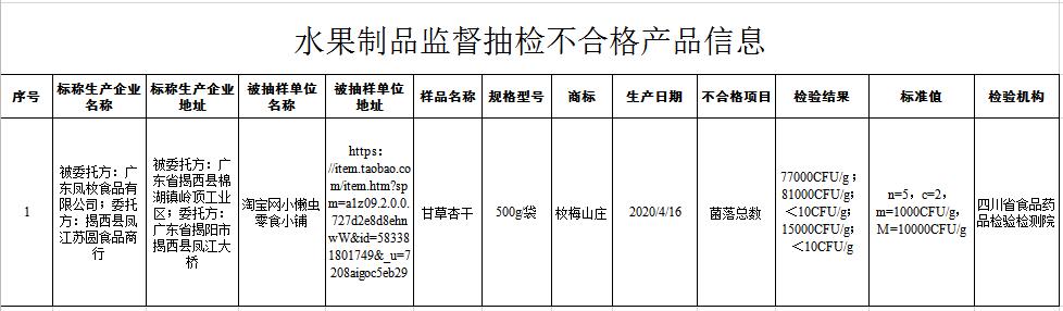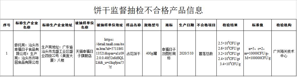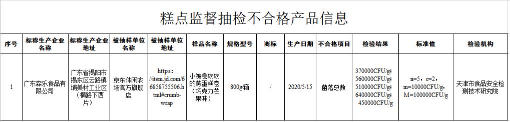 通告显示,淘宝网小懒虫零食小铺(经营者为广东省揭阳市揭西县凤江凤梅食品商行)在淘宝网(网店)销售的、标称广东省揭阳市揭西县凤江苏圆食品商行委托广东凤枚食品有限公司生产的甘草杏干,京东休闲农场官方旗舰店(经营者为广东森乐食品有限公司)在京东商城(网店)销售的、标称广东森乐食品有限公司生产的小被卷软软的蒸蛋糕卷(巧克力芒果味),天猫幸福日子旗舰店(经营者为广东省汕头市幸福日子食品有限公司)在天猫(网店)销售的、标称广东省汕头市幸福日子食品有限公司委托广东省汕头市齐味园食品有限公司生产的占花饼干,菌落总数均不符合食品安全国家标准规定。
