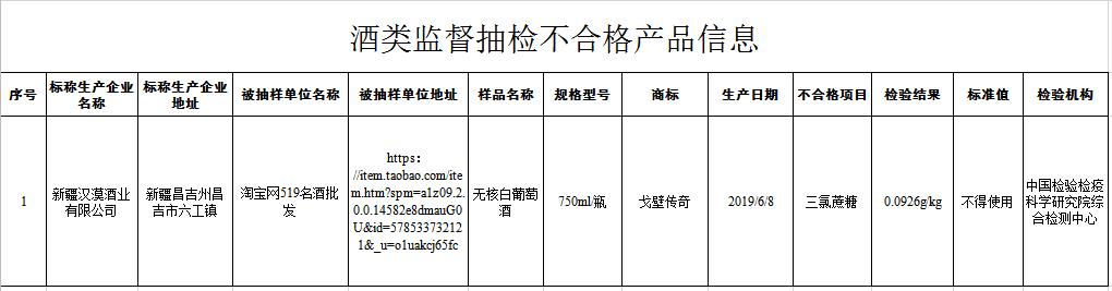 此外,淘宝网519名酒批发(经营者为新疆维吾尔自治区乌鲁木齐市沙依巴克区阿勒泰路久酒源商行)在淘宝网(网店)销售的、标称新疆汉漠酒业有限公司生产的无核白葡萄酒,三氯蔗糖不符合食品安全国家标准规定。