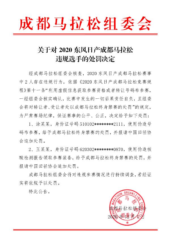 近日,成都马拉松官网发布消息称:在今年的成马赛事中,有两人存在违规行为。其中一人伪造号码布参赛,另一人使用伪造核酸检测报告领取参赛装备。成马组委会对两人给予终身禁赛的处罚,并报请中国田径协会追加处罚。