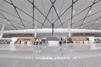 据中建八局天府国际机场T1航站楼项目部技术主管唐磊介绍,T1航站楼的施工已进入尾声,外部幕墙已施工完成,航站楼内部显示屏、指示牌等已调试完成,施工人员正在进行装饰装修的收尾工作,部分机电设备正在进行最后的调试工作。