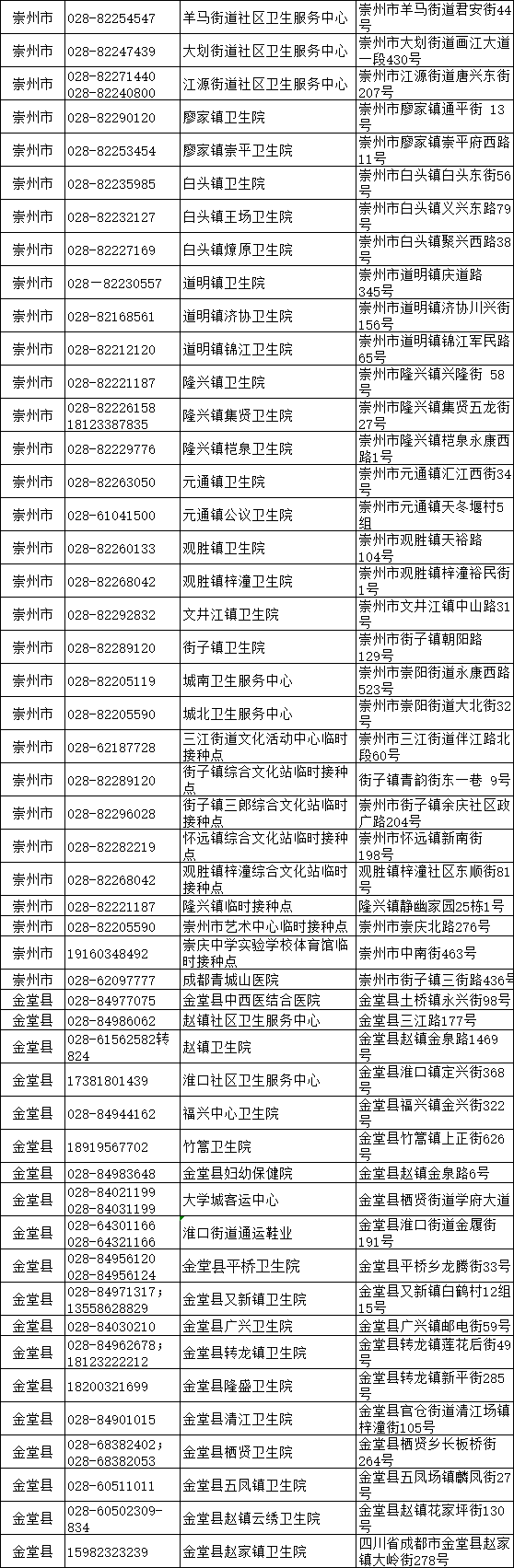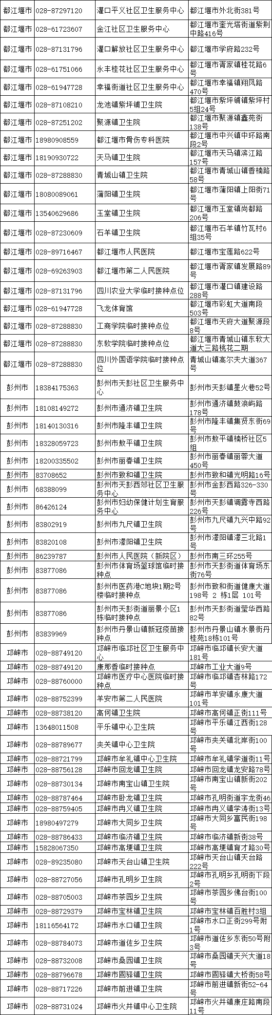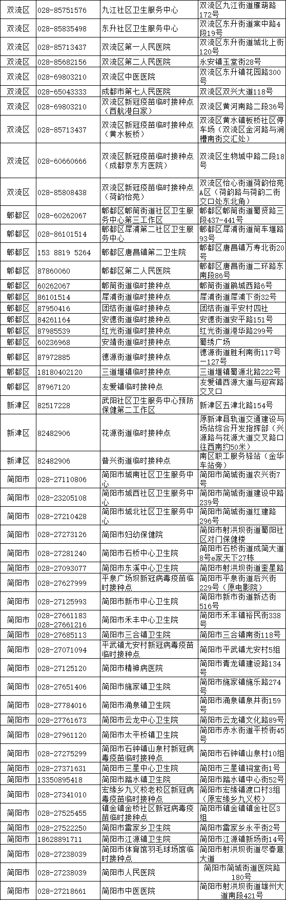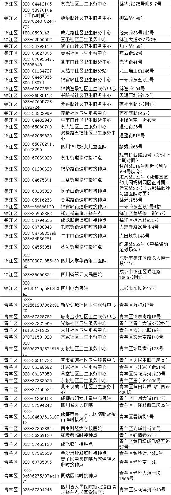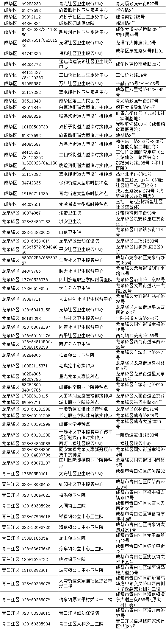 同时,成都市卫健委发布了各区(市)县的预约电话、接种地址等信息。
