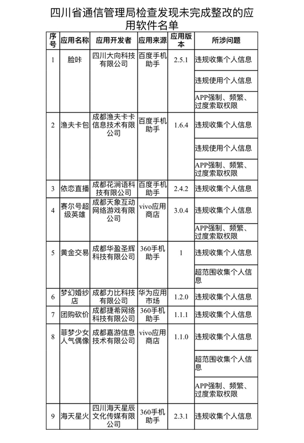 依据《网络安全法》《电信条例》《电信和互联网用户个人信息保护规定》等法律法规,按照《关于开展纵深推进APP侵害用户权益专项整治行动的通知》(工信部信管〔2020〕164号)工作部署,省通信管理局近期组织第三方检测机构对203款手机应用软件开展检测工作,其中11款APP存在“违规收集个人信息”、“超范围收集个人信息”、“APP强制、频繁、过度索取权限”、“强制用户使用定向推送功能”等相关问题,四川省通信管理局已书面要求问题APP相关企业限期整改。