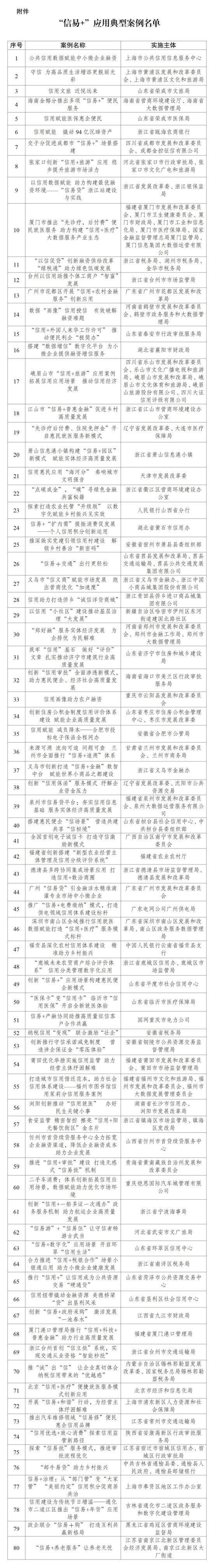 现向社会公开发布评选出的80个“信易+”应用典型案例名单,具体案例内容后续将进行展播,供各地方学习借鉴,复制推广典型做法和成功经验,引导经营主体树立诚信兴商经营理念,助力形成全社会“知信、守信、用信”的大格局,为构建新发展格局、推动经济社会高质量发展贡献力量。