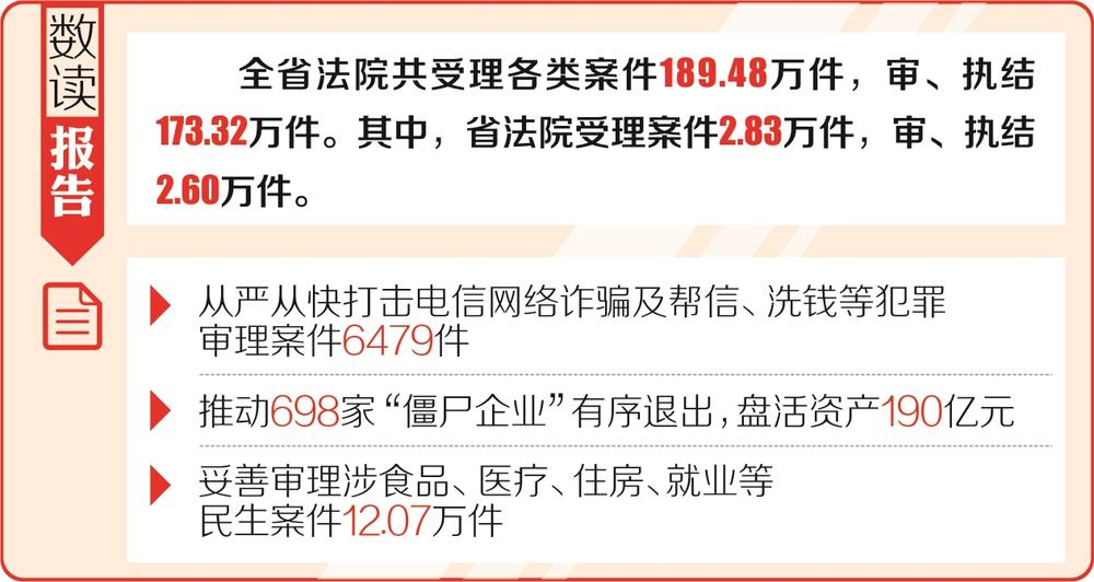 保障市场运行健康有序。稳妥办理涉企案件56.38万件;审理知识产权案件1.89万件;加大知识产权司法保护力度;推动698家“僵尸企业”有序退出,盘活资产190亿元。