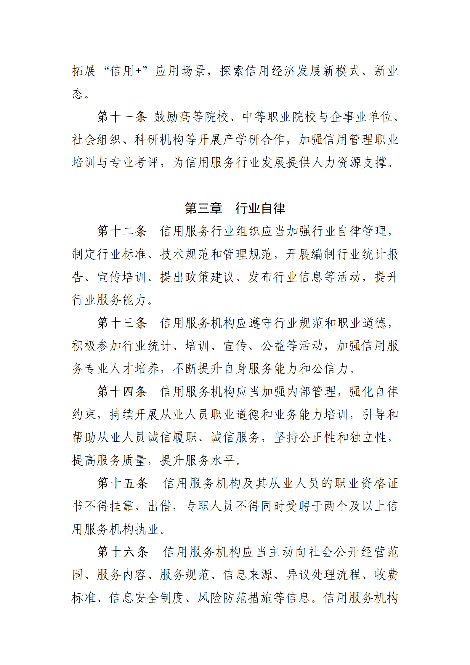 《征求意见稿》包含总则、行业发展、行业自律、机构申报、监督管理、附则共计6章40条。本办法所称信用服务机构是指依法设立,向社会提供信用产品和信用服务,从事信用咨询、信用管理、信用信息服务等相关活动的专业服务机构。信用服务机构开展业务应当遵循合法、客观、审慎和安全的原则,不得侵犯国家秘密、商业秘密、个人隐私和其他个人信息,不得妨碍国家安全、公共安全和公共利益,不得损害信用主体的合法权益,依法依规接受监督管理。
